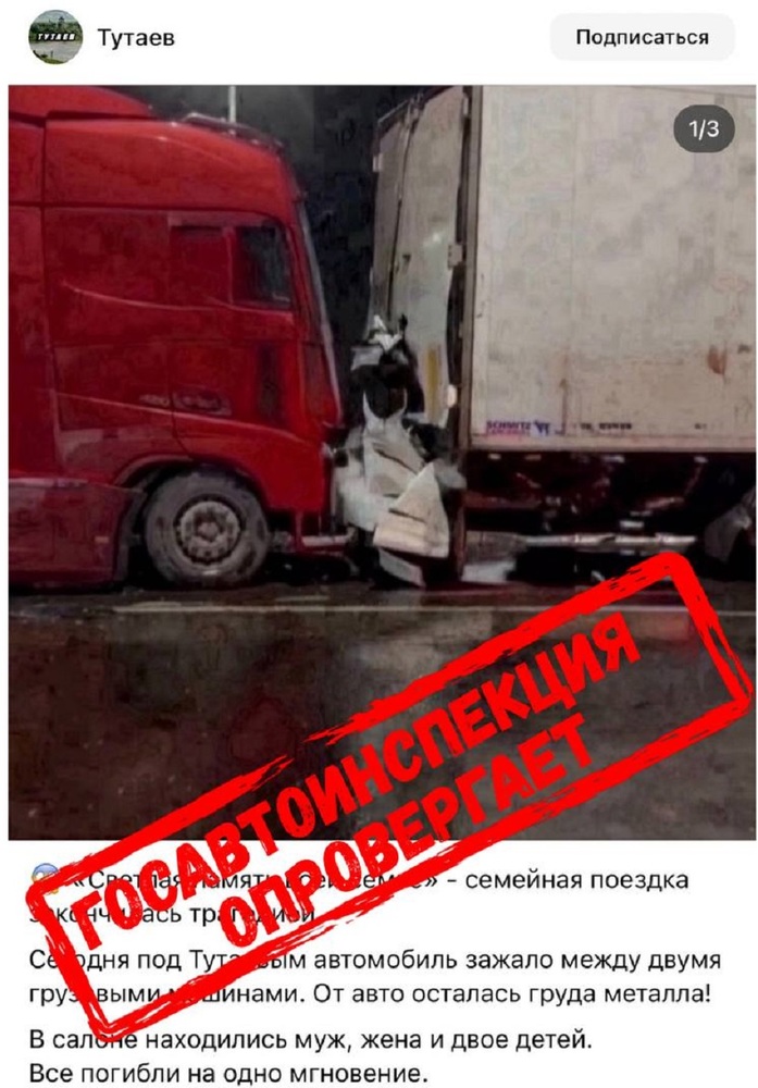 Накануне в ярославских пабликах в сети «Вконтакте», а также в телеграм-каналах стала появляться информация о страшной аварии, которая якобы случилась в нашей области. Сообщалось о гибели семьи – мужа, жены и двоих детей – в ДТП. Якобы легковушку, в которой они ехали, смяло между фурами, и все это случилось на глазах родителей одного из супругов.