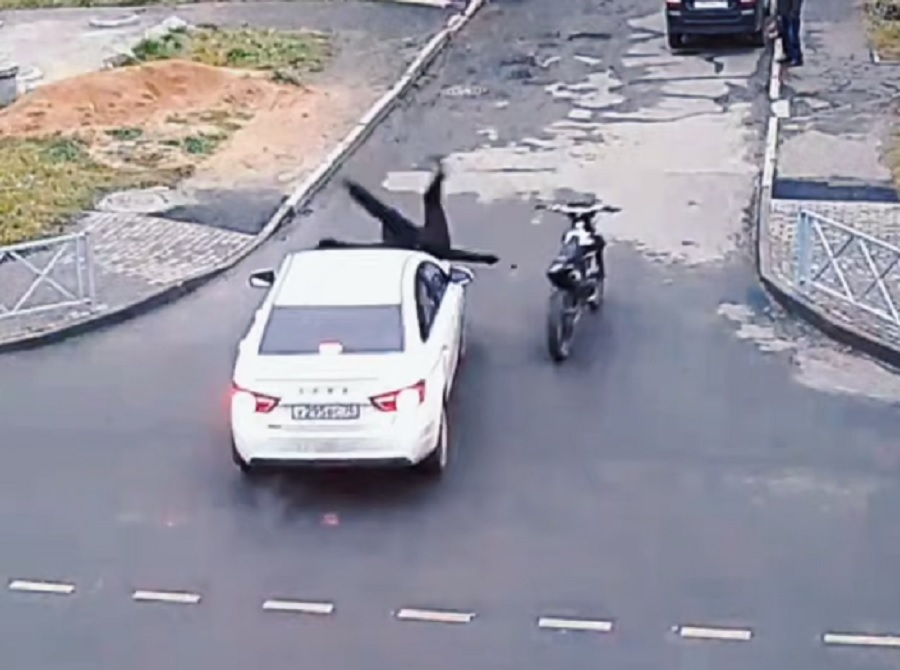На кадрах легковой автомобиль белого цвета. В какой-то момент машина сбивает мотоциклиста. Байк по инерции катится дальше, а его водитель, перевернувшись на капоте легковушки, бежит за своей техникой. Далее он садится за руль мотоцикла и уезжает.