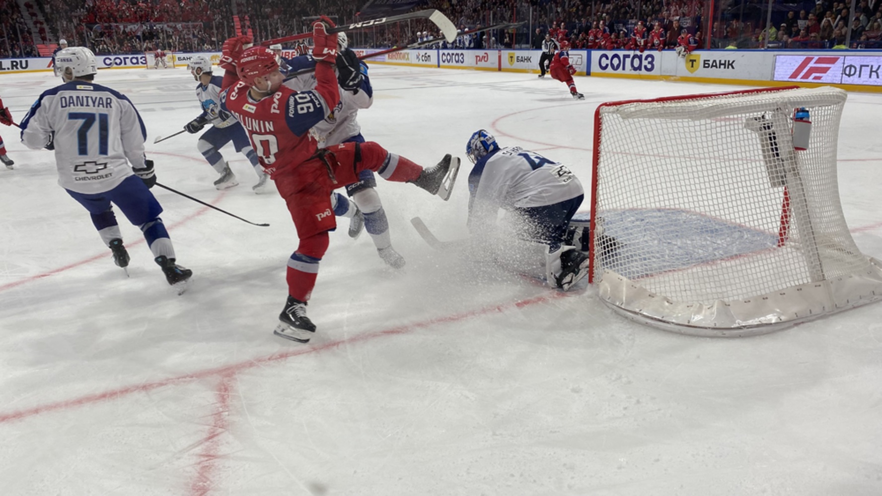 Счет был открыт за минуту до конца периода. Получилась хоккейная классика: бросок от синей линии, подправление от Алихана Омирбекова, и шайба юркнула в ворота. Мельничук показывал игру высоко поднятой клюшкой. Судьи момент просматривали долго, но гол в итоге засчитали. «Барыс» выиграл первый период со счетом 1:0.