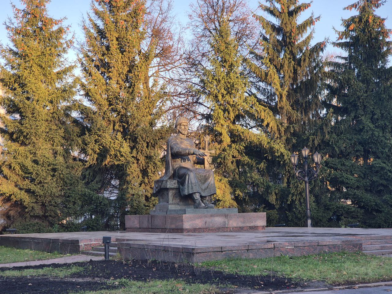 Ну вот и пришло время всё-таки оказаться на «Сковородке». Назвали её так потому, что если смотреть сверху или, например, на карту, очертания совершенно недвусмысленно отсылают именно к этому бытовому предмету. Пока идём, можем полюбоваться и сделать фото у памятника Юрию Долгорукому — основателю Костромы. Он тут не на коне, как в Москве, а сидит на княжеском месте. Троном как-то язык назвать не поворачивается.