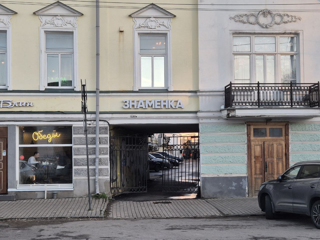 Почти здесь же, на улице Чайковского, где находится вход в центральный парк, можно обнаружить интересную, прежде всего, для ярославцев деталь — вывеску с надписью «Знаменка», что сразу же отсылает нас к Знаменской башне в центре Ярославля. Правда, тут башен нет. Да и сам дом, хотя и является памятником, совсем не монументален.