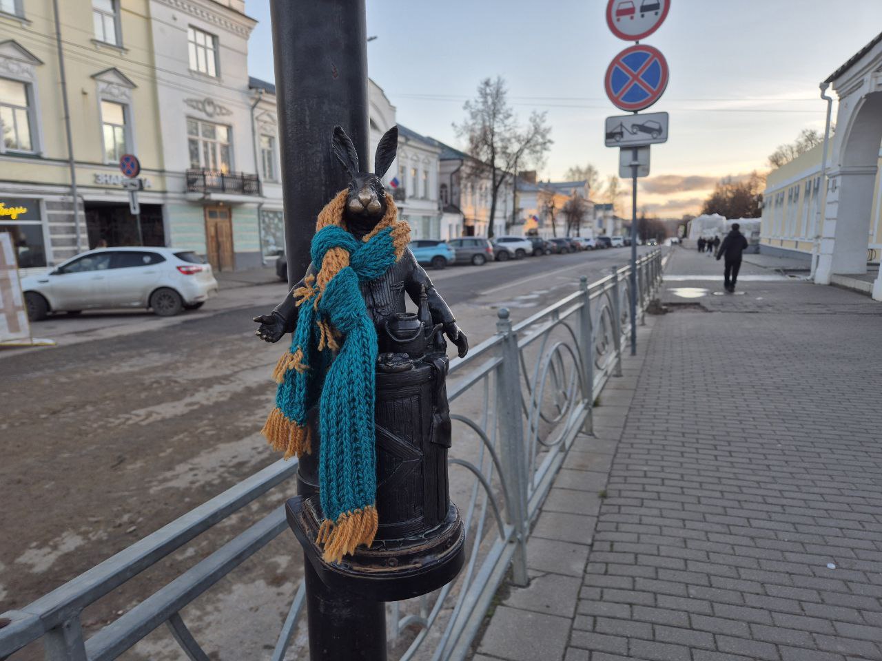 Не исключено, что ранее здесь могло работать заведение с аналогичным названием. Ну а мы двигаемся дальше. Почти здесь же, на другой стороне Чайковского, можно встретить зайца. Приодет он по погоде — в шарф. И таких вот косых в центре Костромы можно найти ещё много. Конечно, сразу вспоминаются наши «Медведики». Ну или калининградские «хомлины». Кстати, рядом с зайцами есть QR-код — он ведёт на квест.