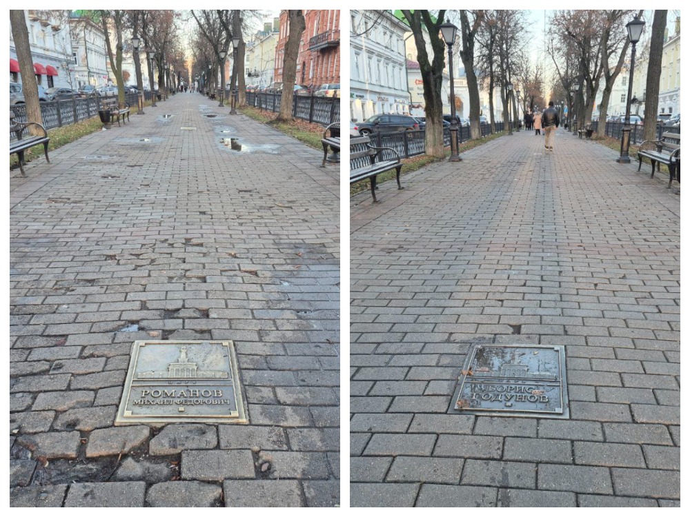 Кстати, сам проспект Мира — это «Костромской Арбат», прямо как у нас улица Кирова. Ещё в 2007 году на пешеходной части улицы была открыта «Аллея признания». Она представляет собой металлические таблички в память о людях «составивших гордость и славу Костроме». Например, здесь можно увидеть имена царей — Бориса Годунова и Михаила Романова.