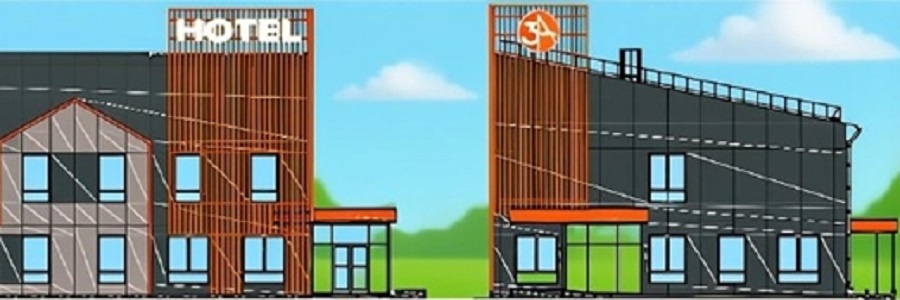 Проектом предусмотрен двухэтажный отель с односкатной кровлей. Гостиница рассчитана на 45 номеров. Причем 43 из них – стандартные одноместные площадью 14,42 квадратных метров. Еще два номера площадью 21,66 квадратных метров каждый предусмотрены для гостей с ограниченными возможностями.