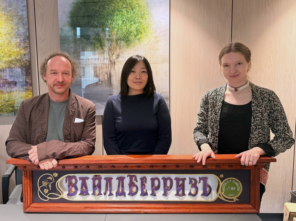 Речь про основательницу Вайлдберриз Татьяну Ким. Не так давно самая богатая женщина России побывала в Рыбинске, где оценила вывеску, сделанную в ретро-стиле. А затем ответный визит ей нанёс художник и автор идея вывесок Митя Кузнецов. Вместе с художницей Ниной Матвеевой он передал Татьяне Ким миниатюру той самой вывески.