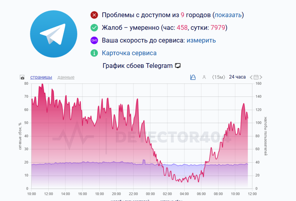Общее количество жалоб на проблемы с Телеграмом на сегодня составляет 2783, что пока сильно меньше, чем за 15 марта, когда в пике показатель достигал цифры в 12 тысяч 727 жалоб. Рост обращений по поводу проблем 16 марта начался, согласно графику, после 6:30 утра.