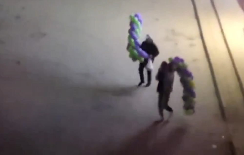 На кадрах, опубликованных в одном из пабликов Ярославля, видно, как двое мужчин идут от торгового центра. У них обоих на плече по связке зелено-фиолетовых шариков. Обычно такими оформляют недавно открывшиеся торговые точки.