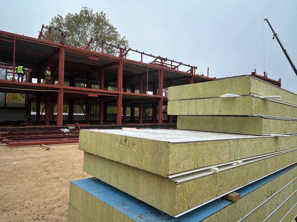 Сейчас на объекте идет монтаж сэндвич-панелей, стропильной системы кровли. Готов каркас для будущей бетонной плиты пола на площади 1300 квадратных метров.