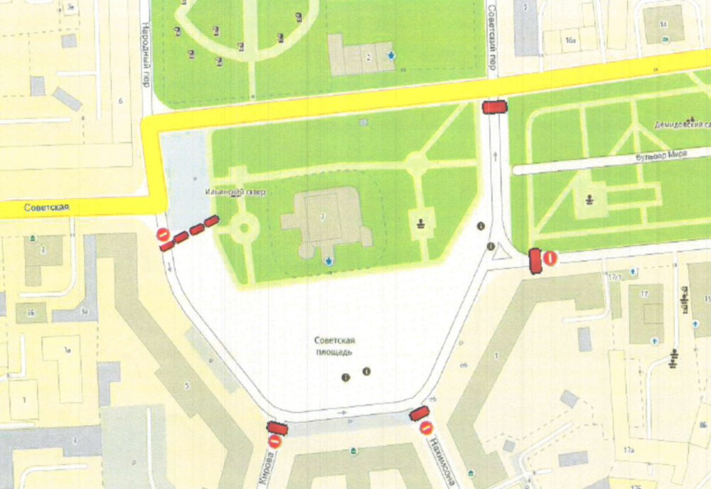 Въезд на Советскую площадь со всех направлений перекроют с 19 часов 17 апреля. Запрет достаточно долгий. Он будет действовать до 23 часов 19 апреля. Ограничения касаются движения по улицам Кирова, Нахимсона, площади Челюскинцев и Советской площади.