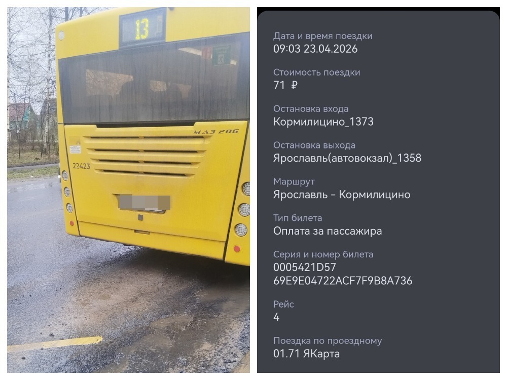 Жалобу на неверно работающий валидатор оставила пассажирка, ехавшая в автобусе №13 из Заволжского района Ярославля во Фрунзенский. Женщина пояснила, что при входе валидатор зарегистрировал вход и оценил поездку в 71 рубль. В сведениях платежа указано, что поездка будто бы была на межмуниципальном маршруте №105 «Ярославль — Кормилицыно».